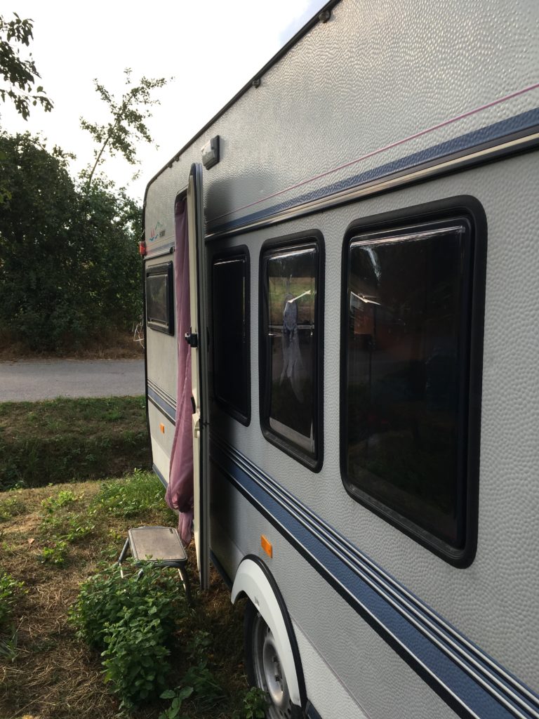 Der Wohnwagen steht auf dem Gelände der Academie, nicht weit vom Stall entfernt.